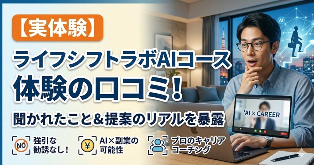 「ライフシフトラボのAIコースって、体験(無料相談)ではどんなことを聞かれるの?」「口コミを見ると『40代・50代向け』って書いてあるけど、30代の自分が受けても浮かない?」「受講料が高いって噂だけど、強引に勧誘されないか不安……」 そんな風に、ラ... -